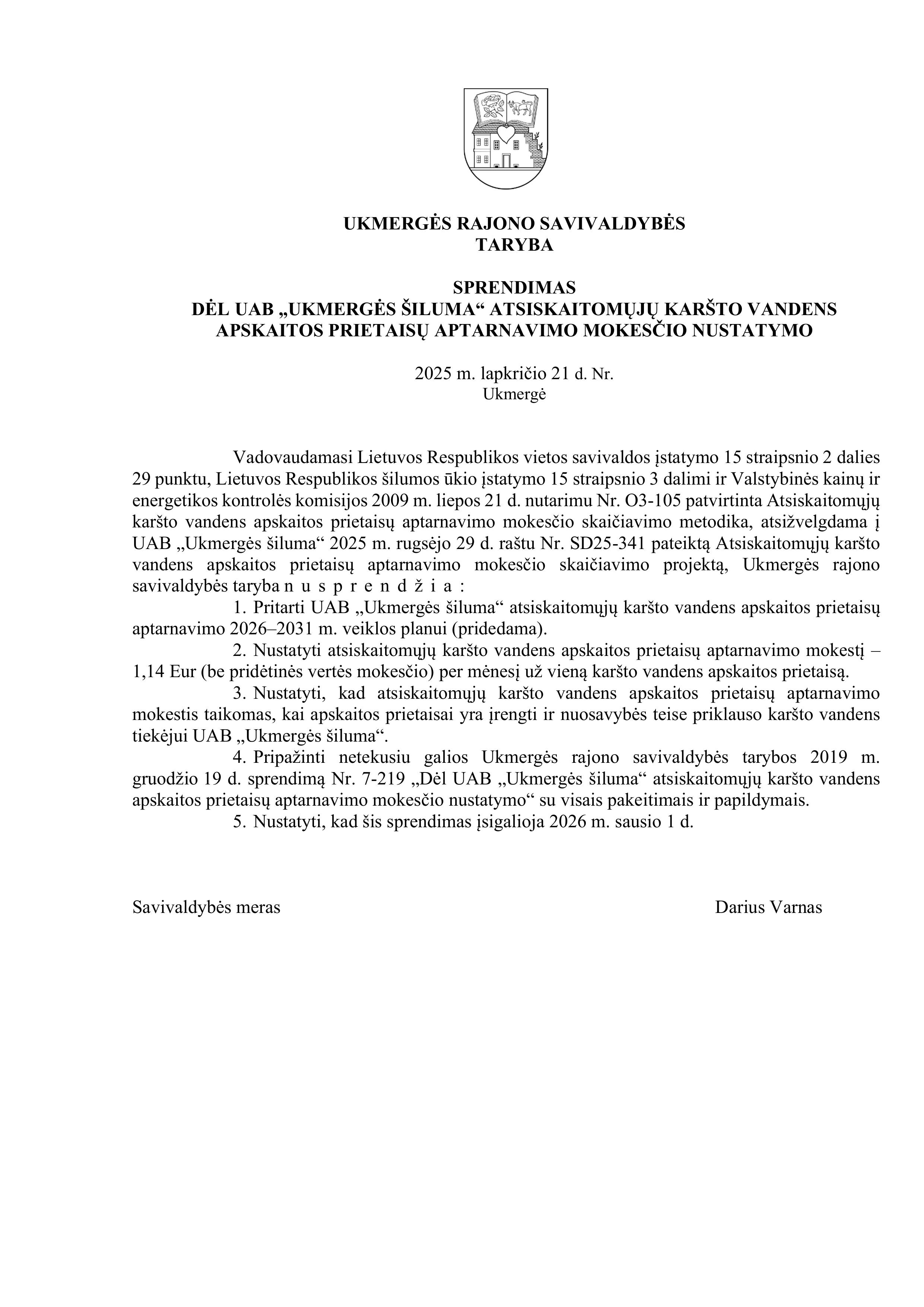 Ukmergės rajono savivaldybės taryba 2025 m. lapkričio 21 d. sprendimu Nr. 7-230 " Dėl UAB "Ukmergės šiluma" atsiskaitomųjų karšto vandens apskaitos prietaisų aptarnavimo mokesčio nustatymo" patvirtino atsiskaitomųjų karšto vandens apskaitos prietaisų aptarnavimo planą 2026-2031 m. laikotarpiui ir nustatė atsiskaitomųjų karšto vandens apskaitos prietaisų aptarnavimo mokestį 1,14 (be PVM) per mėnesį už vieną kašto vandens apskaitos prietaisą. Mokestis bus taikomas nuo 2026 m. sausio 1 d.